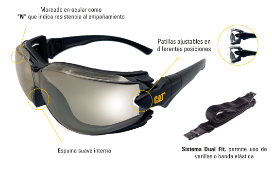 Diseño liviano y sellado con sistema Dual Fit: el usuario puede alternar entre varillas o banda según la exigencia del trabajo. Su forma envolvente mejora la cobertura y confort.